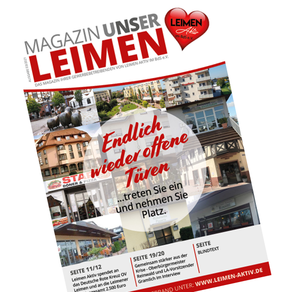 Dann ist eine Anzeige in “UNSER LEIMEN” das richtige Medium für Sie. “UNSER LEIMEN” ist das (Print-) Magazin der Mitgliedsbetriebe von Leimen Aktiv im BdS e. V..